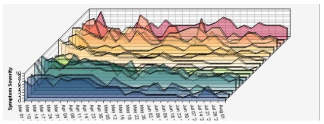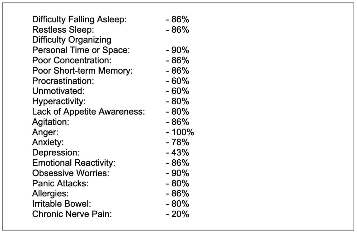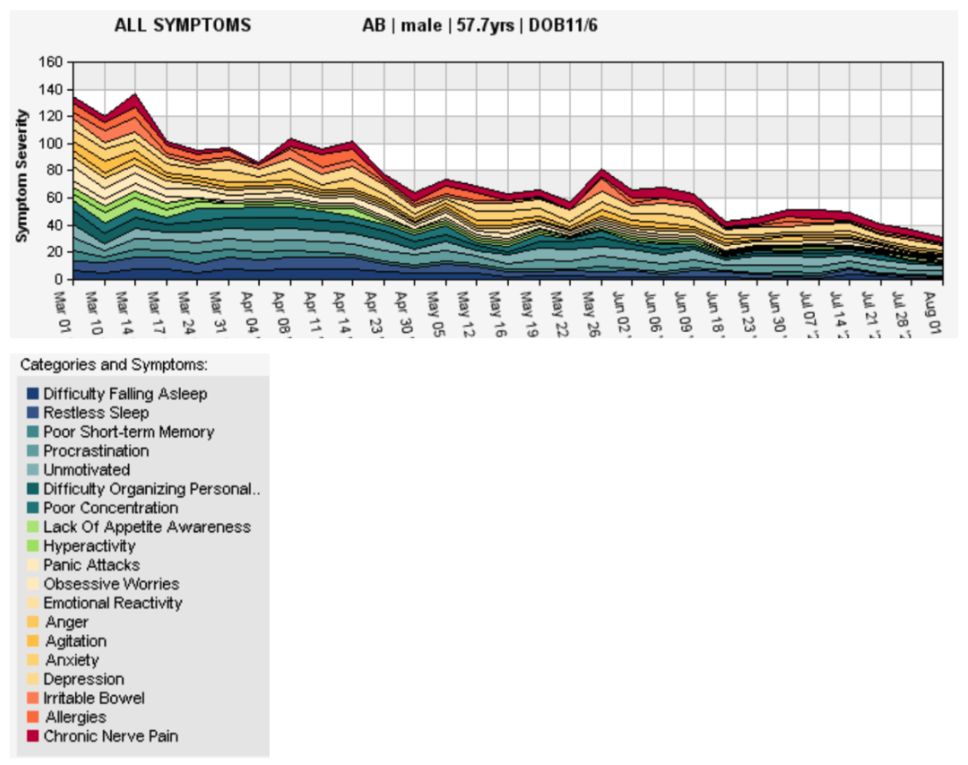 Symptom tracking, conducted weekly, showed an overall reduction in symptom severity of 77%. Symptom severity was ranked on a ten-point scale, with 1 or zero indicating symptom resolution. The only symptom that had not diminished significantly was nerve pain from the client’s damaged Achilles tendons. The only other significant residual symptom was depression. The improvements for specific complaints are shown in the box. This is represented graphically in Figure 1 and 2.