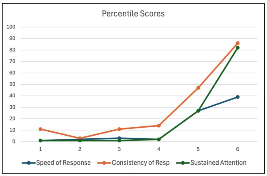 Here the initial results were dire: The veteran was functioning at the first percentile level in terms of sustained attentional function and reaction time. He was functioning at the 11th percentile level in terms of variability. In consequence of the slow reaction time, there was no issue with impulsivity, the only measure found to be in the normal range. Progress in the measures was minimal over the first forty sessions, but radical improvement was observed over the last twenty sessions. At completion of the planned 60-session training, sustained attentional function had improved from the first percentile to the 82nd; mean reaction time had improved from the first percentile to the 39th; and consistency of response had improved from the 11th percentile to the 86th. These results are shown graphically in Figure 3.
